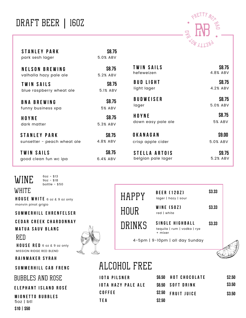 Welcome to PNB - Pretty Not Bad, a delightful dining destination located at 740 Clement Ave #1, Kelowna, BC. This vibrant eatery has captured the hearts of locals and visitors alike with its inviting atmosphere, making it the perfect spot for a casual meal, a refreshing drink, or an exciting happy hour experience. If you’re looking for a place to unwind, celebrate with friends, or just enjoy great food and drinks, PNB should be at the top of your list.